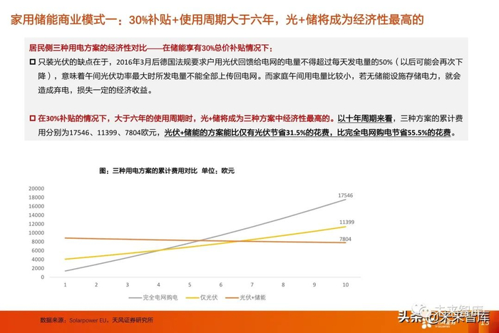 在30% 补贴的情况下,大于六年的使用周期时,光+ 储将成为三种方案中经济性最高的。以十年周期来看,三种方案的累计费用分别为17546、11399、7804欧元, 光伏+ 储能的方案能比仅有光伏节省31.5% 的花费,比完全电网购电节省55.5% 的花费。
