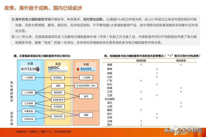 虽然2016年起国内市场就确立了电化学储能在辅助服务市场的主体地位,但定价机制、补偿来源与监管办法仍需完善,而海外发达国家多数已允许电化学储能公平参与市场竞争,其中美国2011 年起即已出台相关法令允许储能进入辅助服务市场。