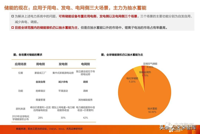 储能的现在:应用于用电、发电、电网侧三大场景,主力为抽水蓄能。