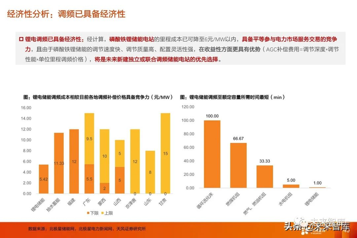 锂电调频已具备经济性:经计算, 磷酸铁锂储能电站的里程成本已可降至6元/MW以内, 具备平等参与电力市场服务交易的竞争力, 且由于磷酸铁锂储能的调节速度快、调节质量高、配置灵活性强, 在收益性方面更具有优势(AGC补偿费用=调节深度*调节性能*单位里程调频价格), 将是未来新建独立或联合调频储能电站的优先选择。