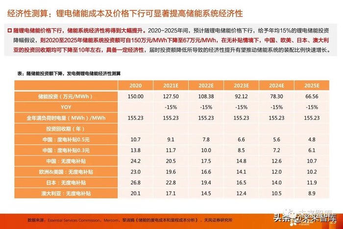随锂电储能价格下行,储能系统经济性将得到大幅提升。2020-2025年间,预计随锂电储能价格下行,给予年均15%的锂电储能投资降幅假设, 则2020至2025年储能系统投资额可自150万元/MWh下降至67万元 /MWh ,在无补贴情境下,中国、欧美、日本、澳大利亚的投资回收期均可下降至 10年左右,具备一定经济性,届时投资额降低所导致的经济性提升有望推动储能系统的装配比例快速增长。