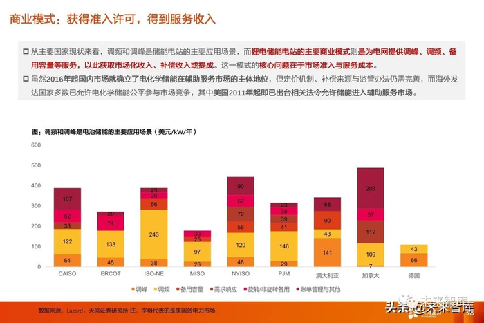 从主要国家现状来看,调频和调峰是储能电站的主要应用场景,而 锂电储能电站的主要商业模式则 是为电网提供调峰、调频、备用容量等服务,以此获取市场化收入、补偿收入或提成。这一模式的核心问题在于市场准入与服务成本。