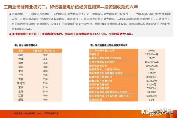 工商业储能商业模式二:降低容量电价的经济性测算—投资回收期约六年。
