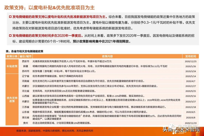 从时间上来看,政策多下发在2020年一季度后,因发电侧电站及储能系统的招标、建设周期合计需要约6个月-1年时间, 预计政策影响将集中在 2021 年得到释放。