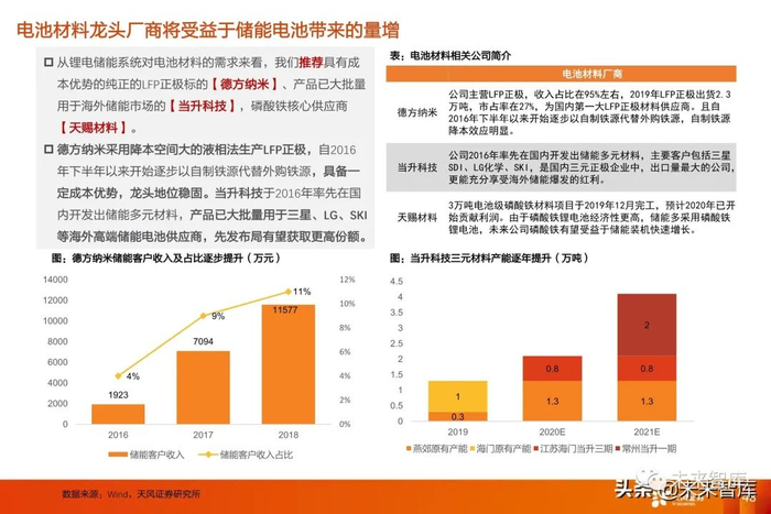德方纳米采用降本空间大的液相法生产LFP 正极,自2016年下半年以来开始逐步以自制铁源代替外购铁源 ,具备一定成本优势, 龙头地位稳固 。当升科技于2016年率先在国内开发出储能多元材料, 产品已大批量用于三星、LG 、SKI等海外高端储能电池供应商,先发布局有望获取更高份额。