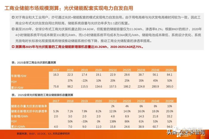 测算得2025 年与光伏配套的工商业储能新增装机容量达33.2GWh ,2020-2025CAGR 达75%