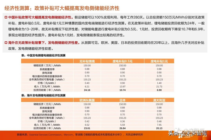 经济性测算:政策补贴可大幅提高发电侧储能经济性