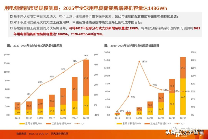 用电侧储能市场规模测算:2025 年全球用电侧储能新增装机容量达148GWh。