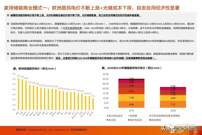 目前欧洲各国平均电价达0.20欧元/kWh+,德国更高达0.31欧元/kWh(合人民币2.5元/kWh)。2008年至2019年间,德国居民电价由21.65欧分/kWh上涨至30.22欧分/kWh,通过拆