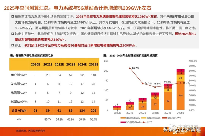 2025年空间测算汇总:电力系统与5G 基站合计新增装机209GWh左右