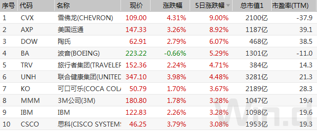 从道指成分股本周涨幅排名来看,雪佛龙、美国运通、陶氏、波音等4家公司本周涨幅超过5%。