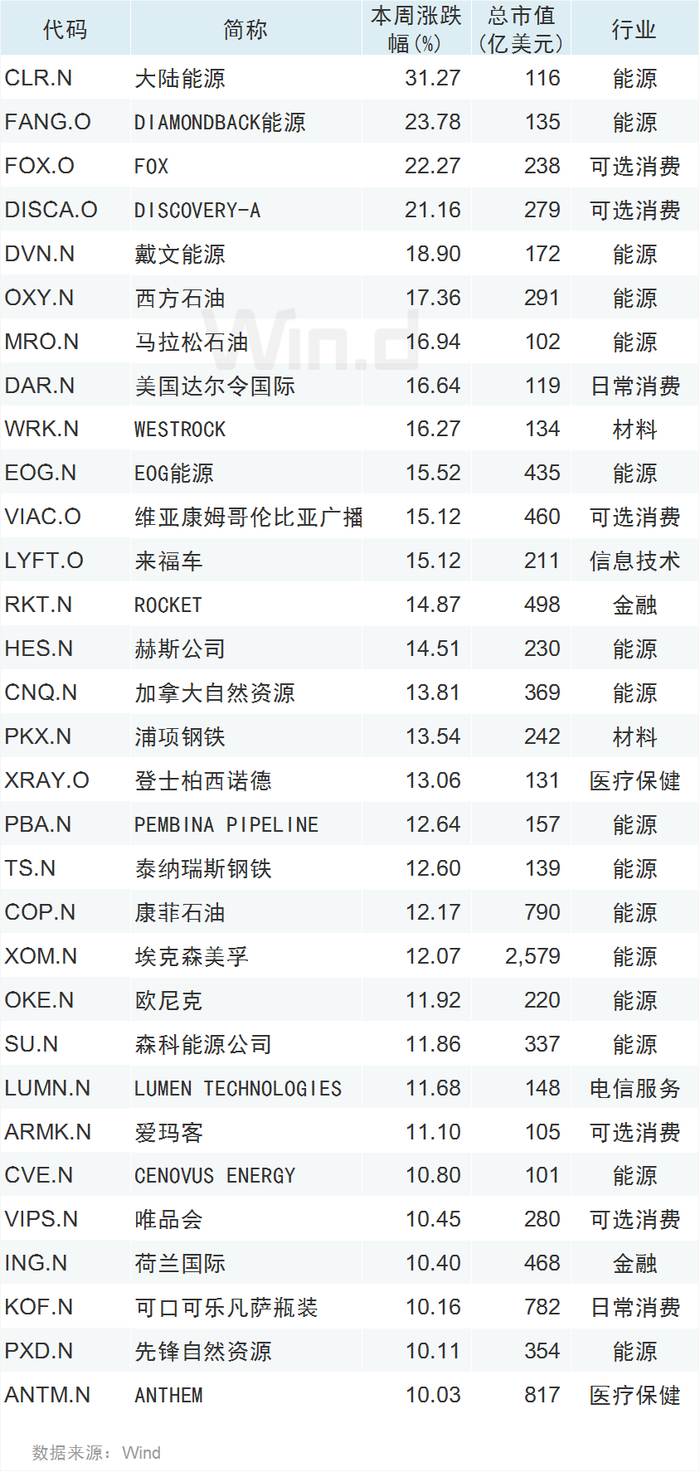 与A股类似,板块轮动是近期资本市场的焦点,美股公司亦如此。从本周涨幅榜来看,有31家市值超过100亿美元的公司本周涨幅超过10%,其中,大陆能源、DIAMONDBACK能源、FOX、DISCOVERY-A等多家公司涨幅超过20%。从涨幅超过10%的公司来看,能源板块占绝大多数。