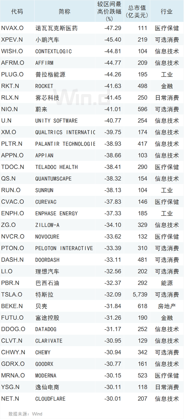 Wind统计显示,截至3月5日收盘,自2月以来最高点累计跌幅超过20%,且总市值大于100亿美元的公司有102家,其中有34家公司自高位回撤超过30%。在跌幅居前的公司,小鹏汽车、雾芯科技、蔚来等三家中概股公司高位回撤超40%。