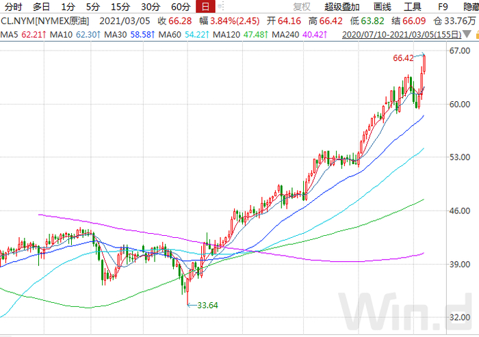 能源板块的大涨与近几个月原油强势拉升密切相关。机构分析称,沙特将延长自愿减产的决定提振了原油多头WTI原油期货涨破66美元/桶欧佩克+昨夜决定维持当前减产规模,与市场的普遍预期不符,且沙特表示将继续自愿减产100万桶/日至4月份,受这两个因素和疫苗推广良好进程推动的复苏正耗尽原油库存的推动,美、布两油今日持续走高,WTI原油期货涨破66美元/桶,布伦特原油期货涨至69美元/桶上方。摩根大通的分析师表示,总的来说,这是我们能预料到的最乐观的结果。高盛今日也将布伦特原油价格第二季度的预期上调至75美元/桶,第三季度的预期上调至80美元/桶。