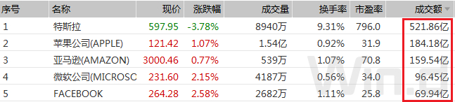 特斯拉作为纳斯达克和标普500的重要的成分股,公司股价的表现,对指数走势起着举足轻重的作用。3月5日,两大指数成交额排名前5的公司均为特斯拉、苹果、亚马逊、微软、FACEBOOK,且特斯拉一只个股成交额高达521.86亿美元,超过后面排名4家的总和。