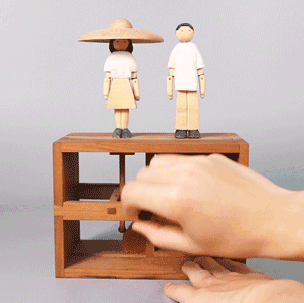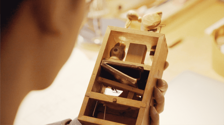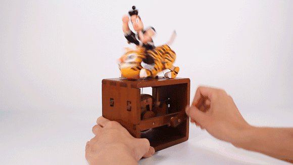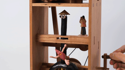 机构部分与“舞台”部分,是构成“机巧”的两个部分。机构的运转带动舞台元素的运转,最终实现表演的功能。内部结构的外露是为了增加作品的观赏性。
