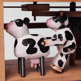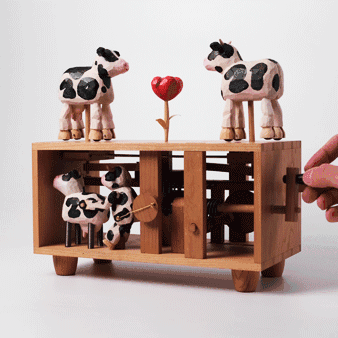上面两只牛在分开的时候心会裂开,靠近的时候,碎裂的心又会聚合,底下两只小牛,会很卖力地在工作。