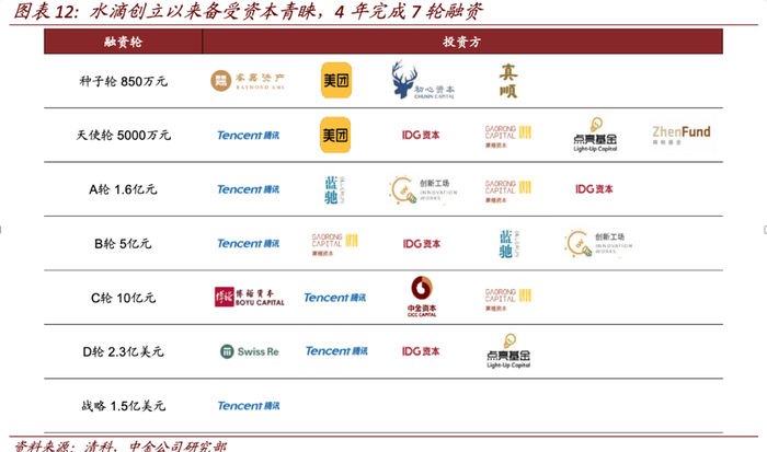 公开资料显示,截至2021年3月,水滴共完成7轮融资,总额约40亿元人民币,投资方中不少业界重量级大咖。而其中最引人注目的,是种子轮、天使轮率先加磅的美团,以及从天使轮一直坚持到D轮,乃至在Pro-IPO阶段独自梭哈1.5亿美元的“鹅厂”。