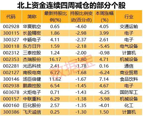 北上资金连续4周卖出102股。分行业来看,医药生物、计算机行业个股数量居前,各有13只。从持股比例变动情况来看,与4周前相比,23股减仓比例超1%。华夏航空减仓幅度最大,相比4周前减仓了4.6%,其他减仓幅度较大的还有长盈精密、中颖电子、东方日升、三泰控股、杰瑞股份等。