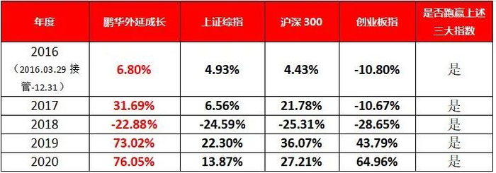 她管理时间最长的鹏华外延基金自16年初接手以来,每一年都跑赢上证、沪深300和创业板指数这样的主流宽基指数。
