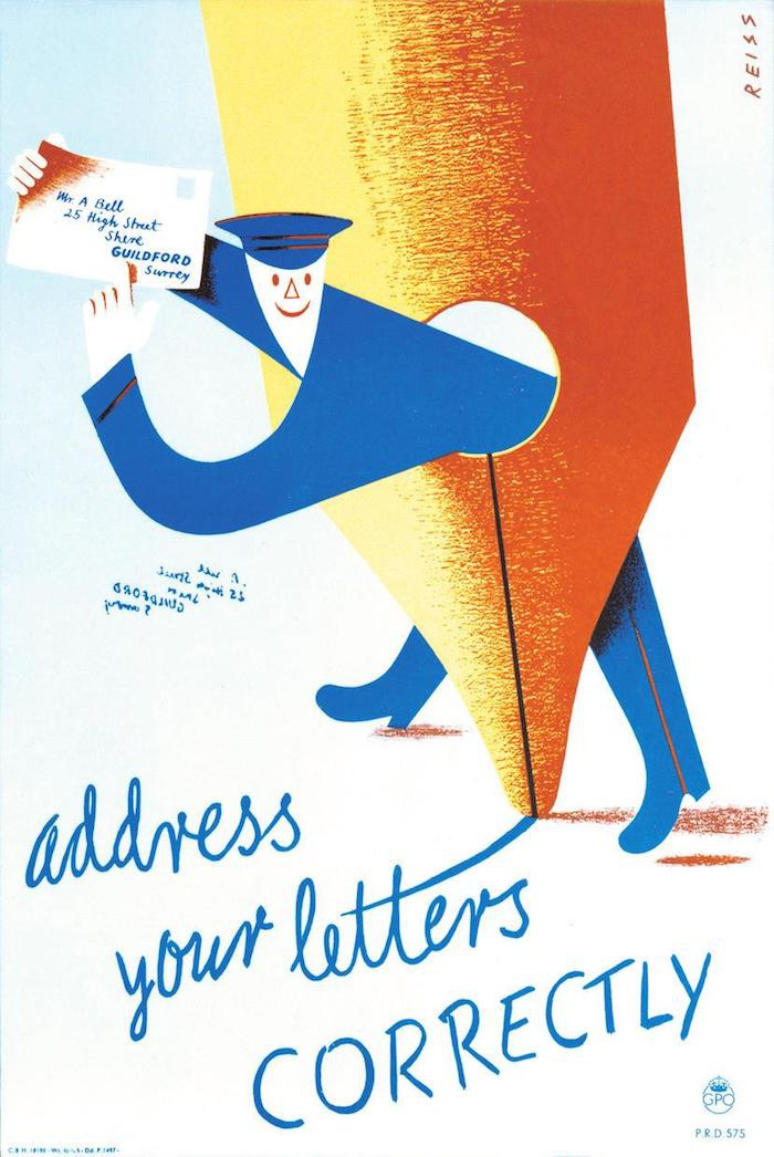 《寄信地址要写对》,曼弗雷德·瑞斯(Manfred Reiss) 1950年设计。出生在德国的瑞斯,父母都是波兰犹太人,他们察觉到氛围有所变化,于是在1937年举家迁往伦敦,时年瑞斯15岁。作为一名设计师,英国邮政总局是他的主要客户之一。1949年,在纽约现代艺术博物馆举办的“来自16个国家的新海报”设计展中,瑞斯的两幅海报入选。