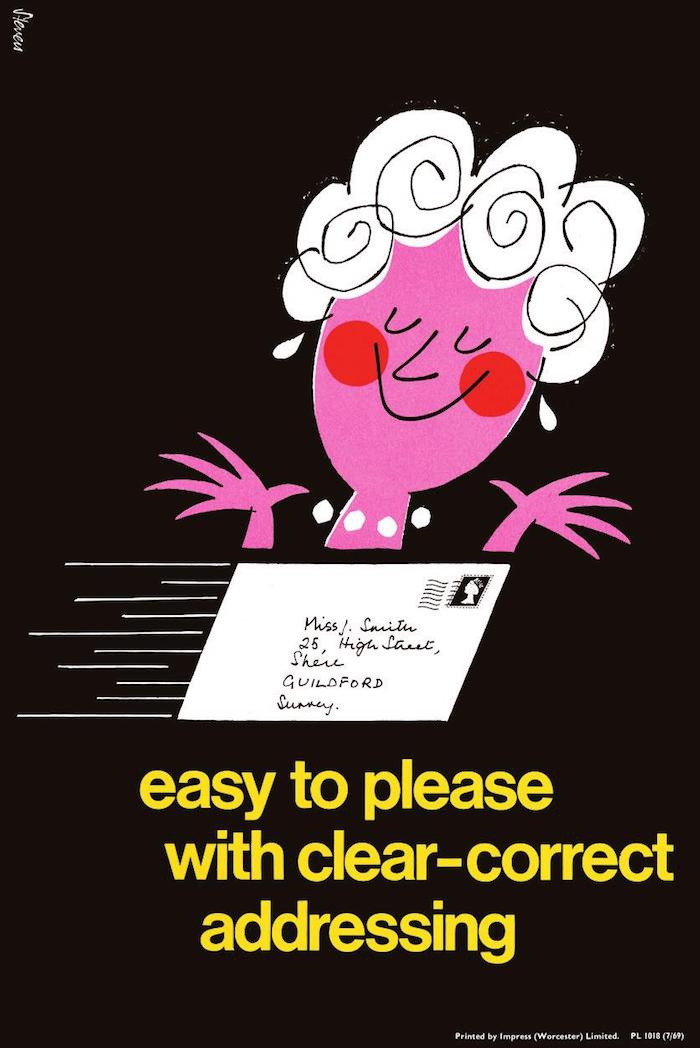 《寄件地址清楚准确,邮局姐姐很好取悦》,哈里·史蒂文斯1969年设计。哈里·史蒂文斯1919年出生于曼彻斯特,为英国邮政总局、英国铁路和伦敦运输局设计过大量海报。