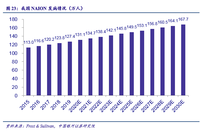市场空间与竞争格局:NAION 的典型发病年龄在45~65岁之间。根据Frost & Sullivan 的预测,到2024 年,我国老龄化人口预计数量达到2.285亿人。随着我国进入老龄化社会,NAION 发病率也在不断增加。我国NAION 发病人数从2015年的8.6万人增长到2019年的11.6万人,期间复合年增长率为7.7%。预计于2024年,40岁以上NAION发病人数将增长至15.3万人。针对NAION 尚无确证有效的治疗药物,患者面临着无药可用的困境。《我国非动脉炎性前部缺血性视神经病变诊断和治疗专家共识》推荐的治疗方案包括糖皮质激素治疗、控制全身疾病及其他危险因素以及其他辅助治疗。SR061 是首款通过抑制Caspase2 提供视神经保护的药物,有望成为首款治疗NAION、青光眼等视神经损伤疾病的药物,填补临床治疗市场空白。国外已完成的临床I 期研究已展现出SR061 良好的视力改善效果。
