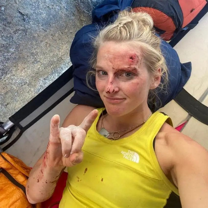 “鲜血刚开始从她的脸上流下来,滴到了腹带处的我身上,”在她身后负责保护的,哈灵顿的男友巴林格说,他在哈灵顿绳子的另一端与霍诺德换了位置。“我们都想起了去年那次可怕的跌落,当时认为她这次攀登应该就到此为止了。”