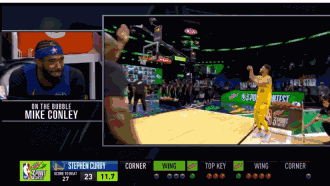 第一轮初赛连续命中9球,其中就包括了超远三分的那个绿球,以第一名的身份晋级决赛。而到了第二轮,当康利投出27分的高分之后,库里在前半程手感不佳的情况下,后半程连续命中。