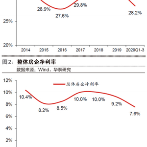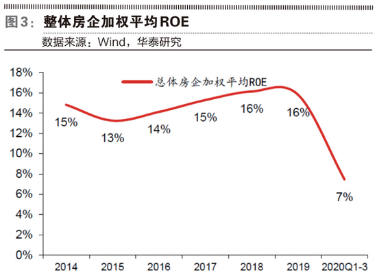 ROE和报表利润率同期在2018年触顶后回落。根据华泰证券的统计,2019年整体房企加权平均ROE同比下行0.3个百分点,而随着利润率持续探底,叠加少数股东损益占比提升和投资收益降幅扩大,2020年前三季度整体房企ROE达7.4%,较2019前三季度下滑2.3个百分点,龙头房企ROE仍保持在10%以上。