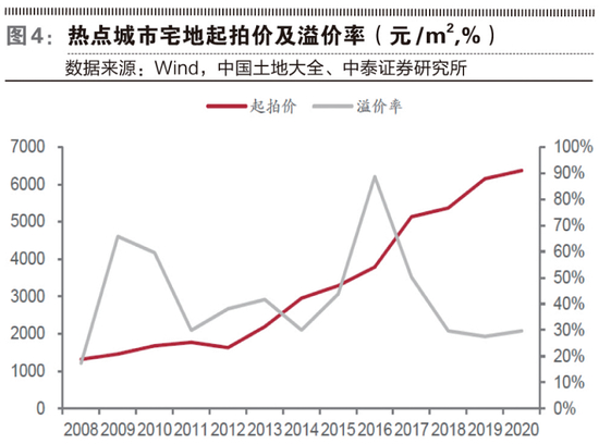 从一二线核心城市土地市场成交量价来看,2015年后,热点城市土地市场持续量价稳健增长,2015年至2020年,住宅类用地成交建筑面积由2.04亿平方米增长至2.8亿平方米(约占百城土地住宅类用地的40%左右),5年复合增速6.5%;成交平均楼面价由4726元/平方米增长至8260元/平方米,5年复合增速11.8%。