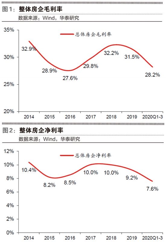 因此,华泰证券表示,市场看到的房企利润率往往是最滞后的。从结果上看,房企报表利润率从2018年以来逐步下滑(最新财报期2020年三季度):2020年前三季度整体房企毛利率为28.2%,较2018年高点下滑4个百分点,其中龙头、中型、小型房企毛利率分别为25.2%、33.9%、28.6%,较2018年高点分别下滑5.2、1.0、5.2个百分点。2020年前三季度整体房企归母净利率为7.6%,较2018全年下滑2.4个百分点。