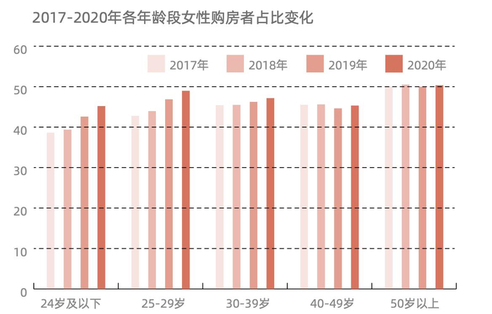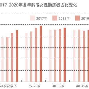 新时代带来新消费态度,从24岁以下、25-29岁两个年龄段女性成为房地产增量市场的主要贡献力量可见一斑。根据贝壳研究院调查,2020年,24岁以下、25-29岁女性购房客群占比为45.21%和48.99%,较2017年分别提升6.58个百分点和6.22个百分点,增速明显高于其他年龄段女性。
