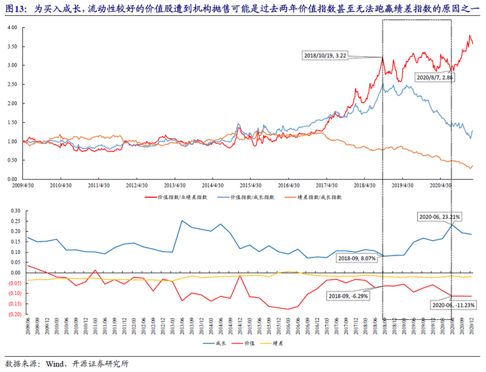 背后的一个原因是:为买入成长股,流动性较好的价值股遭到机构抛售可能是过去两年价值指数甚至无法跑赢绩差指数的原因之一。自2018年Q4以来,机构在价值股上的低配比例由-6.29%下降至-11.2%;而对成长股的超配由8.07%抬升到了23.21%。由于过去两年市场充裕的流动性使得“赛道论”成为了市场主流,成长股因此而广泛受益,机构投资者为买入成长股,不得不抛售流动性相对更好的价值股,使得价值股的估值长期被压制,股价表现甚至与绩差股不分上下。