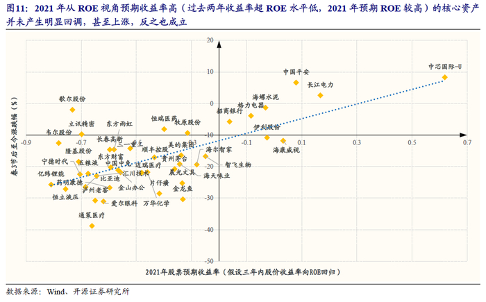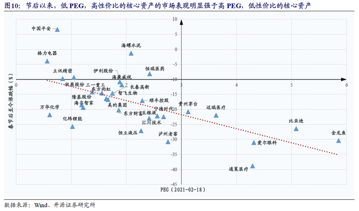 当然,并非所有核心资产都失去了参与的意义,在重新考量性价比下,核心资产内部也出现了明显分化,市场已经做出了选择:我们发现,核心资产从PEG和回归ROE的角度,已经很好的给出了答案:节后以来,低PEG,高性价比的核心资产的市场表现明显强于高PEG,低性价比的核心资产;而2021年从ROE视角预期收益率高(过去两年收益率超ROE水平低,2021年预期ROE较高)的核心资产并未产生明显回调,甚至上涨,展现出了更强的韧性。