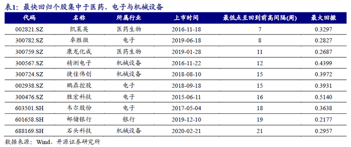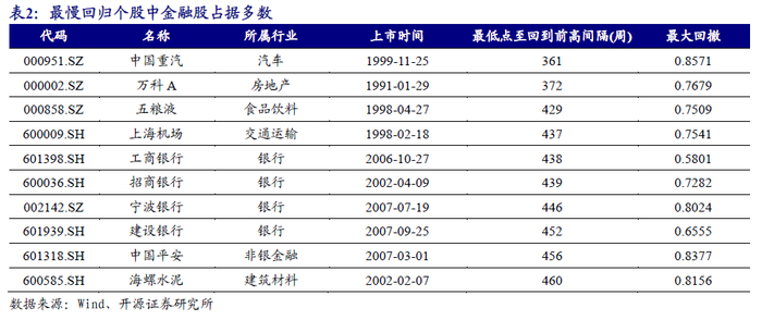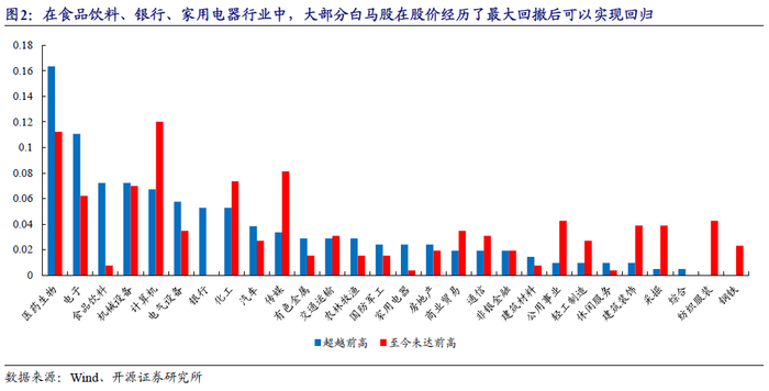 医药生物、电子、机械设备、计算机、化工等行业的白马股中,既有大量在经历最大回撤后,股价表现可以超越前高,也有大量至今尚未超越前高,可以认为在该部分行业中,尽管可能存在着大量白马股,然而投资者对行业内真正的具备长期增长潜力的白马股的辨别难度较大,即使是机构投资者也不免频频“踩雷”。而在公用事业、建筑装饰、采掘、纺织服装、钢铁等成熟行业中,大量白马股在经历了其最大回撤后,至今无法回到原来的股价水平;而与此相反,在食品饮料、银行、家用电器行业中,大部分白马股在股价经历了最大回撤后可以实现回归,尤其是银行回归比例达到了100%。