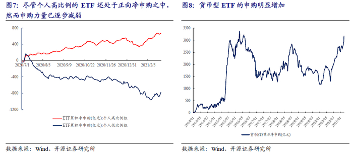 部分机构投资者发现担忧的居民在负债端的负向正反馈并未发生,甚至部分产品还出现了明显的“抄底”资金,成为了投资者认为大反攻即将到来的证据。我们从数据上对上述观点提出两点必要的反驳:第一,以个人投资者参与为主的ETF作为我们曾论证过的负债端代理变量,当下确实并未出现大幅赎回,但是申购已经在减弱;第二,更重要的是,当下货币类ETF出现了类似2018年6月和2015年5-6月的大幅申购,可能大量投资者已经开始选择落袋为安。市场正在从相对收益者为主导转向以绝对收益者为主导。定价逻辑正在从“害怕错过”变成“担心失去”。