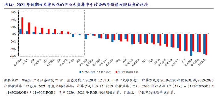 作为专业的机构投资者,我们可以随时卖出,但却永远无法离开市场。在当下潜在的高名义经济增长,高贴现率的宏观环境里,我们乐观的因素只能押注经济复苏后的景气扩散与价值回归。具体而言,当下我们认为更应该配置:以地产、保险、银行、交通运输、钢铁、采掘、建筑、农林牧渔(养殖 、种植链)为代表的PB-ROE视角的价值股。在这一领域中,无论是基于碳中和、一带一路等主题投资,还是已经出现基本面变化的银行、保险(利率上行)和房地产(集中供地),都为市场提供了价值回归的信号。顺周期的下一轮行情则需等待全球经济复苏共振的信号,即景气扩散后更广维度的价值发现,产能周期的重估远未结束。