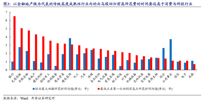 我们接着计算了股价得以回归的个股从最低点第一次反弹到前高时所花费的时间,即使部分机构曾经重仓的白马股可以回归前高,其付出的时间成本代价也是昂贵的。所有个股平均所用时间为31.49个月,长达两年半之久;两年左右可以回归的个股达到126只;一年左右可以回归的股票仅有46只。其中,以金融地产链为代表的传统高度成熟性行业内的白马股回归前高所花费的时间要远高于消费与科技行业,值得注意的是传统行业中采掘似乎表现比较意外,行业内的白马股迅速实现了回归,而科技板块的国防军工回归时间则明显高于其他科技行业。