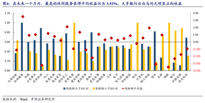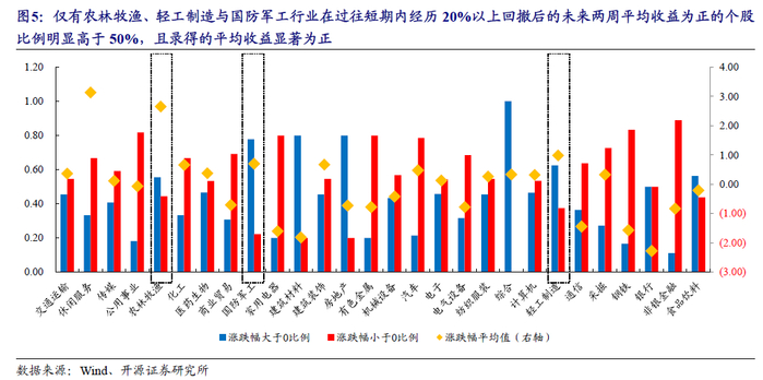 而从行业角度来看,可以认为,绝大部分行业内的白马股在经历了短期较大回调(20%以上)后,押注未来短期企稳反弹的胜率并不高。仅有农林牧渔、轻工制造与国防军工行业在过往短期内经历20%以上回撤后的未来两周平均收益为正的个股比例明显高于50%,且录得的平均收益显著为正。绝大部分行业既无法录得正向收益,同时不足一半的个股平均收益为正,其中家用电器、钢铁与非银金融尤为明显。而在未来一个月内,最高的休闲服务录得平均收益仅为3.52%,大多数行业均无明显正向收益。