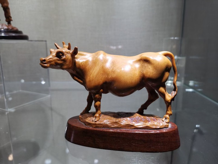 事实上,徐老的黄杨木雕题材宽泛,宗教历史、儿童、农村都是他的创作对象。或许因童年时有一段土山湾孤儿工艺院的生活和学艺经历,徐宝庆的这些作品总有脉脉温情,他把对人,对动物,乃至一草一木的观察、理解和情感,都化作刻刀下的美,让观众在屏息观赏间获得了艺术享受。澎湃新闻记者在展厅现场所见,几乎都是年长的观众,他们三三两两环绕展柜,小声谈论。一位老观众轻声地对同伴说:“耐看”。