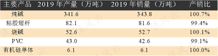 2019年公司共生产纯碱341.6万吨,销量343.8万吨,产销比为100.7%;粘胶短纤产量82.1万吨,销量81.6万吨,产销比为99.4%。