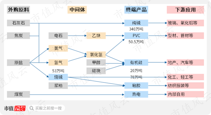 公司现有产能包括粘胶短纤78万吨/年、纯碱340万吨/年、烧碱53万吨/年(自用+外销)、PVC50.5万吨/年和有机硅单体20万吨/年。