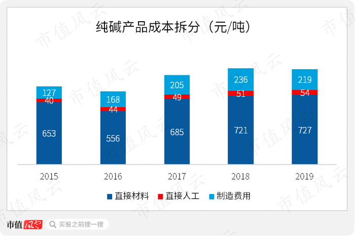 公司纯碱制造费用稳定,过去3年公司纯碱成本在940-1010元/吨之间波动,其中人工成本在50元/吨左右,制造费用210-230元/吨,主要变动来自原材料价格变动。每吨纯碱需要消耗1.5吨原盐,公司纯碱材料成本与原盐价格正相关。