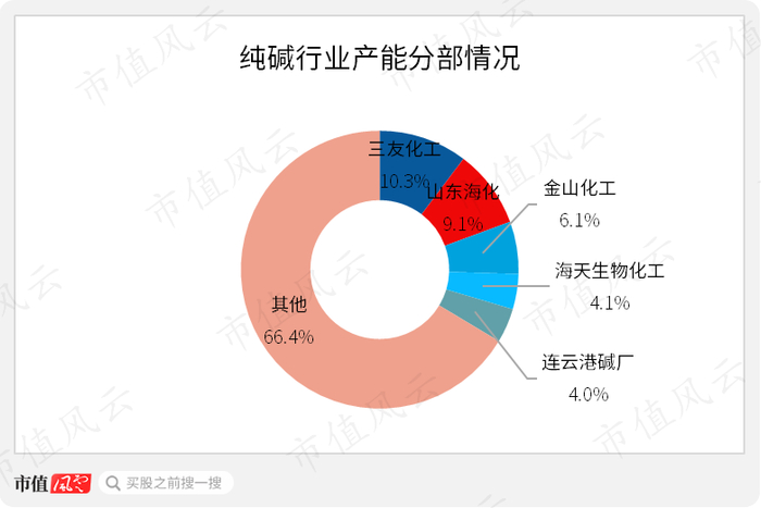 公司的国内纯碱市场份额达到10.3%,产能位居全国第一。排名第二的山东海化(000822.SZ)市场份额为9.1%;金山化工的市场份额为6.1%;行业CR5为33.6%。