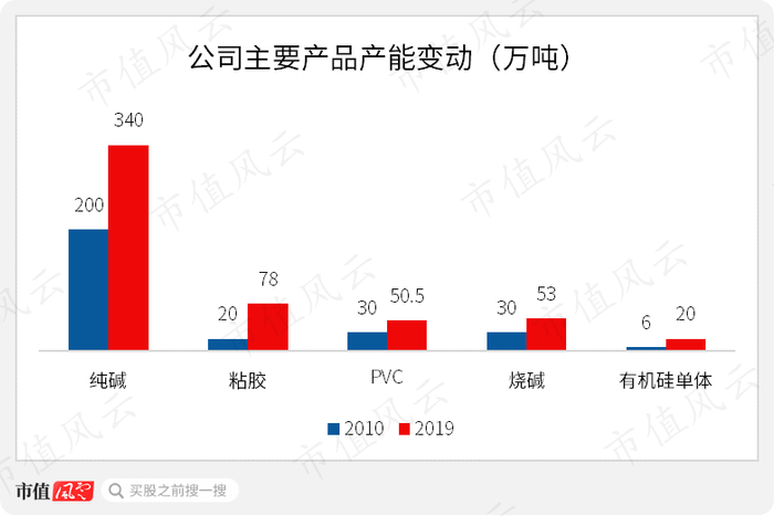 其中,纯碱2010年的产能为200万吨,目前增加至340万吨,主要为公司原有项目产能改扩建以及新建青海五彩矿业110万吨项目。