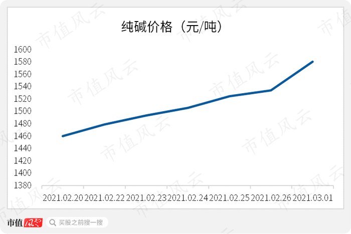根据卓创资讯数据,未来2年我国纯碱规划产能在180万吨上下,产能增量5.4%,预计行业维持供需偏紧状态。2020年12月以来,在光伏玻璃等旺盛需求推升下,纯碱价格持续走高,截止2020年3月1日,纯碱价格达到1591元/吨。