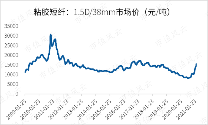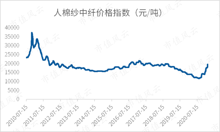2020年下半年以来,粘胶短纤产品下游的纺织业复苏明显。从粘胶短纤的直接下游产品价格上看,至2020年3月1日,人棉纱的价格已经反弹至一年以来的最高水平,达到19600元/吨,可见行业景气度较高。