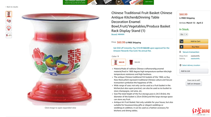 目前在美亚官网上,虽仍有零星几家店铺在售,其中一家显示剩余库存18件。一用户问此产品的功能,店家不忘补充道:“用途多样,可用作器物装日用品,也可当作垃圾桶和便盆”。不过也有某些明白人好心奉劝:“这是尿桶,别用来装食物!”