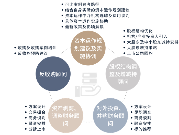 目前,文艺馥欣的主要业务分为并购顾问、并购基金投资以及商学院三部分。区别于传统券商的并购部门,文艺馥欣从为监管审批制作申报材料的基础性工作中脱身出来,专注于为基于A股上市公司的大型复杂并购重组交易提供以方案设计与商务谈判为核心的投资银行服务,并嫁接并购基金投资。此外,文艺馥欣也根据客户需求,针对性地提供资本市场培训服务。